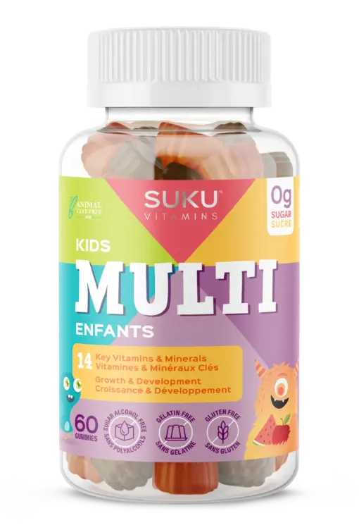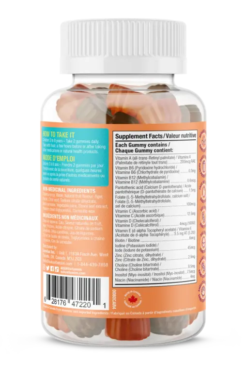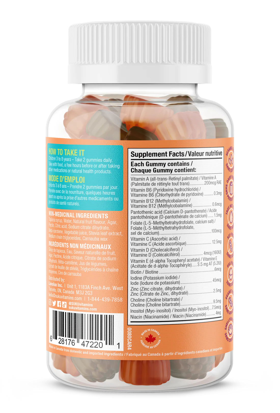 A complete daily multivitamin in delicious vegan gummies designed for children ages 3–8. Includes 14 essential vitamins & minerals, plus prebiotic fiber, to help fill nutritional gaps and support immunity & growth.