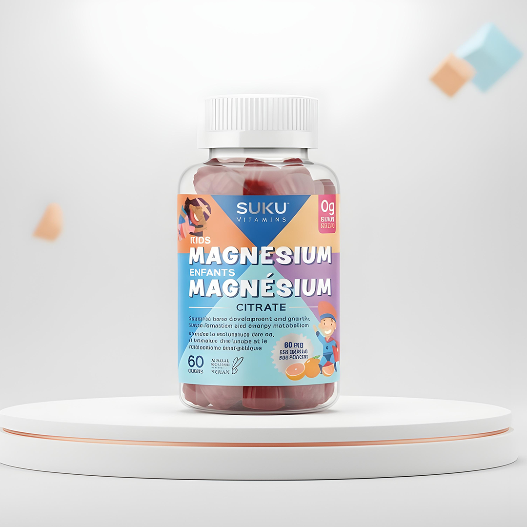 SUKU Vitamins Kids Magnesium Citrate gummies support normal muscle function, bones/teeth development, and everyday wellness, 40 mg magnesium citrate per gummy (80 mg per 2), sugar-free, kid-approved flavour.